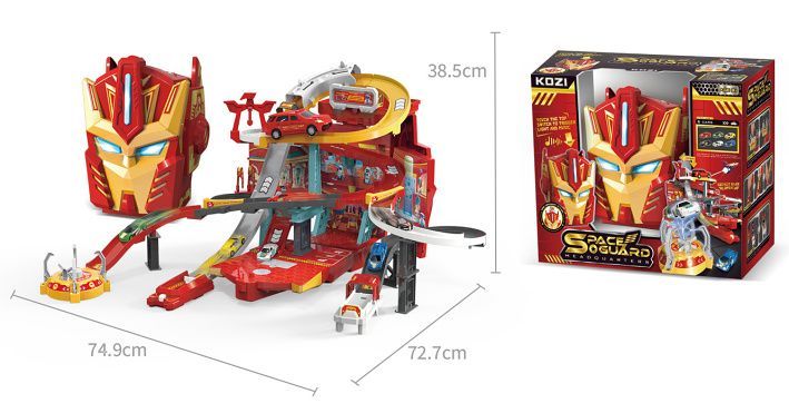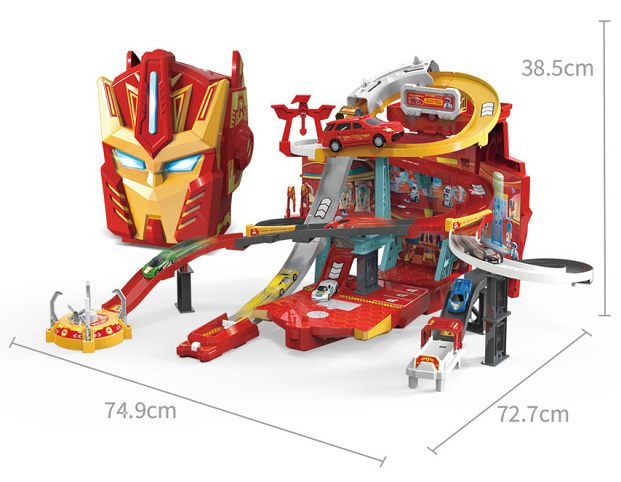 Přenosná rozkládací dráha ve tvaru autorobota. Rozměry 75x73x39 cm. Světelné a zvukové efekty. 2xAA baterie nejsou součástí. Součástí 6 aut, vystřelovací dráha, parkoviště.