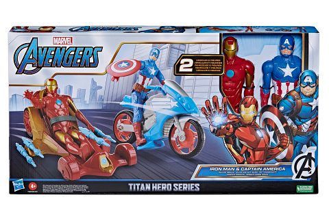 Sada figurek Avengers Kapitám Amerika a Iron man. Balení obsahuje 2 figurky o velikosti cca 30 cm, motorku a vozidlo. Figurky mají pohyblivé ruce a nohy. Věk 4+
