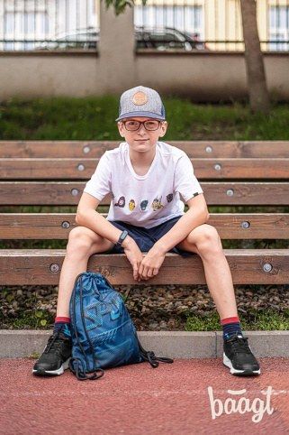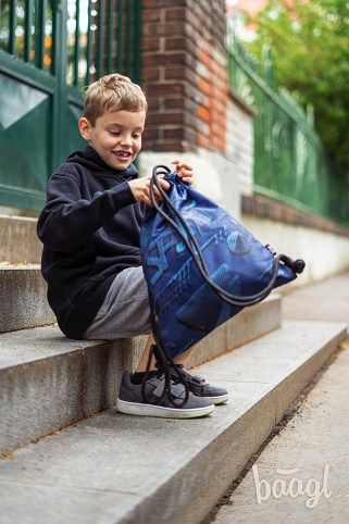 • Sáček na cvičky nebo přezůvky z pevného omyvatelného materiálu. • Zdrhování pomocí pevných tkanic, které zároveň umožňují nošení na zádech.