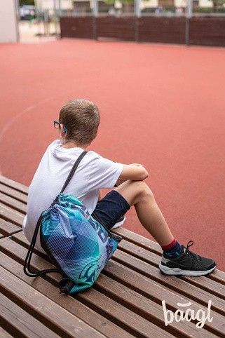 • Sáček na cvičky nebo přezůvky z pevného omyvatelného materiálu. • Zdrhování pomocí pevných tkanic, které zároveň umožňují nošení na zádech.