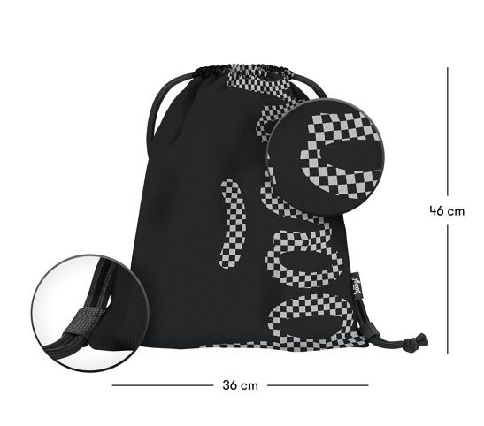 • Sáček na cvičky nebo přezůvky s logem BAAGL, které ve tmě svítí. • Zdrhování pomocí pevných tkanic, které zároveň umožňují nošení na zádech