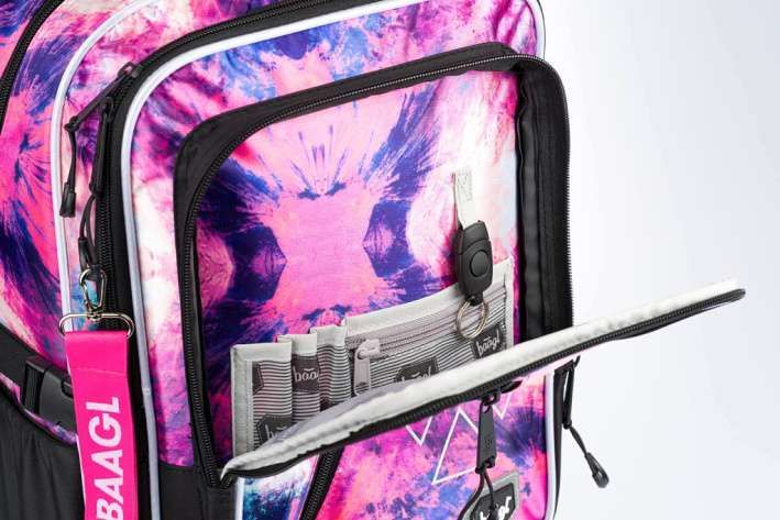 Batoh je vybaven růžovým přívěskem s logem BAAGL.