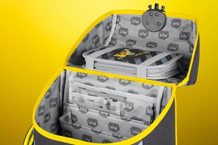 Uvnitř aktovky je průhledná kapsa s rozvrhem a vnitřní organizér umožňující rovnoměrné rozložení hmotnosti.