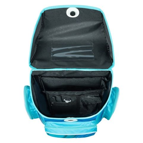 Uvnitř aktovky je průhledná kapsa na rozvrh a vnitřní organizér umožňující rovnoměrné rozložení hmotnosti.