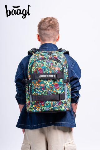 ŠKOLNÍ BATOH SKATE MINECRAFT CHAOS Populární model Skate, s hmotností nepřesahující 900 g a popruhy na uchycení skateboardu, je ideální pro žáky již od třetí třídy ZŠ. Anatomicky tvarovaná záda s výztuží v oblasti beder a plně nastavitelné kompresní popruhy umožňují optimální přizpůsobení postavě. Batoh Skate je vybaven třemi samostatně uzavíratelnými komorami, vnitřním organizérem a polstrovanou kapsou na 15palcový notebook nebo tablet. Batoh z recyklovaného, voděodolného materiálu je opatřen řadou reflexních prvků pro maximální bezpečnost dítěte i za snížené viditelnosti. Batoh Skate disponuje spolehlivými zipy prestižní japonské značky YKK. Postranní kapsy, ideální například na tritanové láhve BAAGL, jsou vyrobeny z pevného materiálu sladěného s designem batohu. Ke každému batohu lze pořídit další produkty ve stejném designu, takže jej snadno sladíte s penálem, sáčkem na obuv a dalšími školními pomůckami. Součástí batohu je také stylový přívěsek. Batoh Skate splňuje podmínky Institutu pro testování a certifikaci (ITC) ve Zlíně a nezávislé laboratoře QIMA.