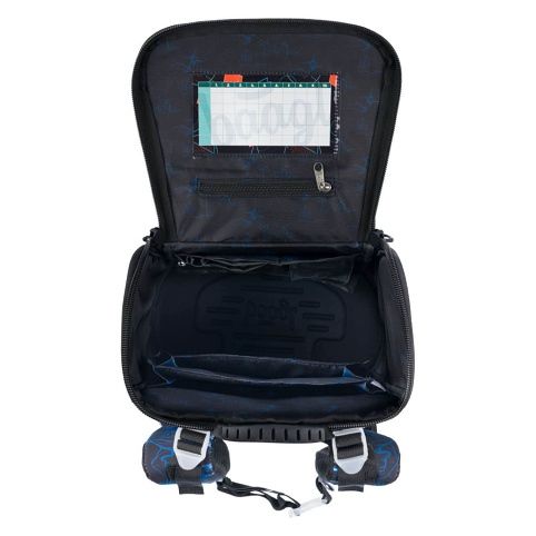Uvnitř aktovky je průhledná kapsa s rozvrhem a vnitřní organizér umožňující rovnoměrné rozložení hmotnosti, doplněný gumičkou pro fixaci.