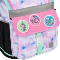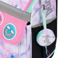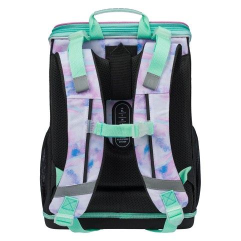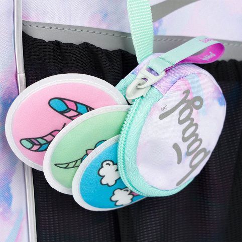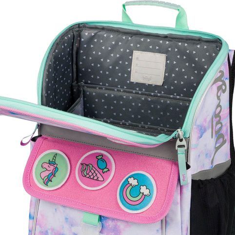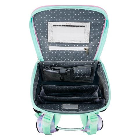 Uvnitř aktovky je průhledná kapsa s rozvrhem a vnitřní organizér umožňující rovnoměrné rozložení hmotnosti, doplněný gumičkou pro fixaci.