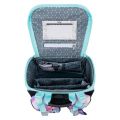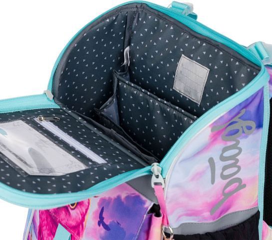 Uvnitř aktovky je průhledná kapsa s rozvrhem a vnitřní organizér umožňující rovnoměrné rozložení hmotnosti, doplněný gumičkou pro fixaci.