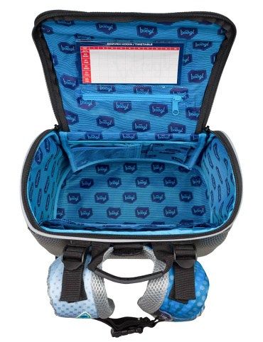 Uvnitř aktovky je průhledná kapsa s rozvrhem a vnitřní organizér umožňující rovnoměrné rozložení hmotnosti, doplněný gumičkou pro fixaci.