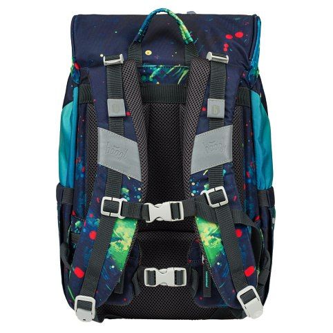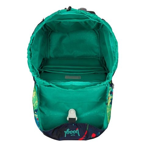 Jednokomorové vnitřní uspořádání s kapsou a gumičkou pro uchycení desek na zádové straně slouží ke snadné organizaci všech školních pomůcek.
