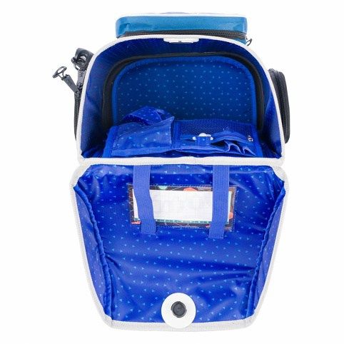 Uvnitř aktovky je průhledná kapsa s rozvrhem a vnitřní organizér umožňující rovnoměrné rozložení hmotnosti.