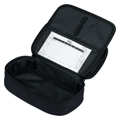 ŠKOLNÍ PENÁL ETUE DARKNESS Pevný školní penál s výklopnou vnitřní přepážkou. Vnitřní kapsa na zip a kapsa na rozvrh. Etue je vyrobená z recyklovaného materiálu a všechny zipy jsou značky YKK. Bez náplně.