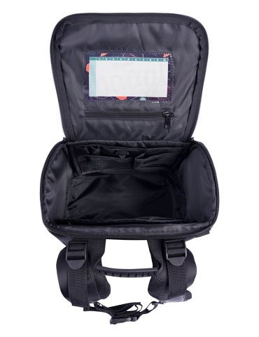 Uvnitř aktovky je průhledná kapsa s rozvrhem a vnitřní organizér umožňující rovnoměrné rozložení hmotnosti, doplněný gumičkou pro fixaci.