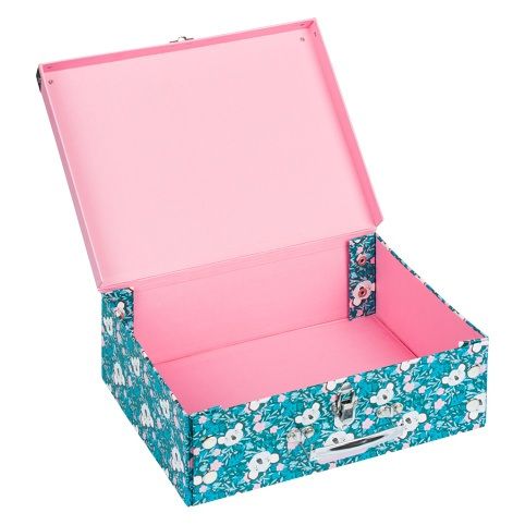 Skládací kufřík z pevného laminovaného papíru s okovanými rohy.