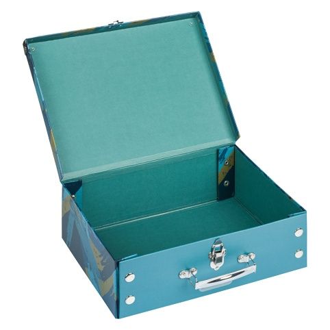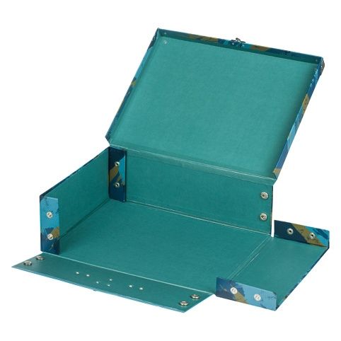 Skládací kufřík z pevného laminovaného papíru s okovanými rohy.