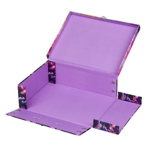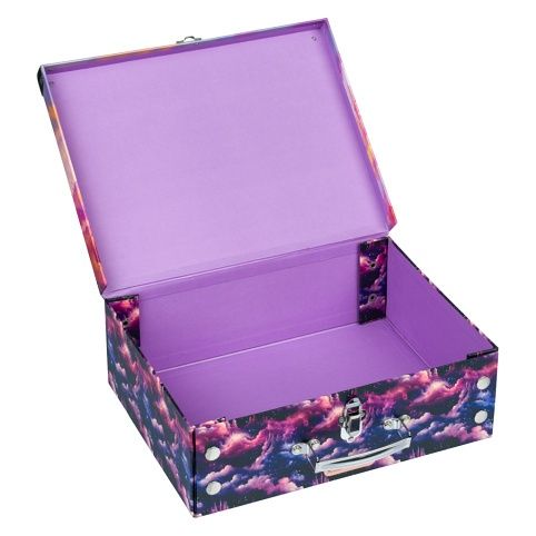 • Skládací kufřík z pevného laminovaného papíru s okovanými rohy.