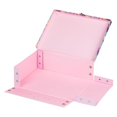 Skládací kufřík z pevného laminovaného papíru s okovanými rohy.