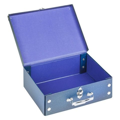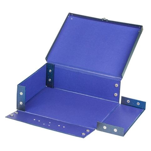 Skládací kufřík z pevného laminovaného papíru s okovanými rohy.