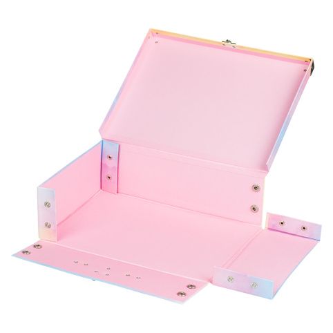 Skládací kufřík z pevného laminovaného papíru s okovanými rohy.