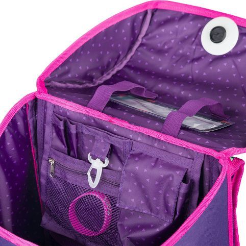 Uvnitř aktovky je průhledná kapsa s rozvrhem a vnitřní organizér umožňující rovnoměrné rozložení hmotnosti.