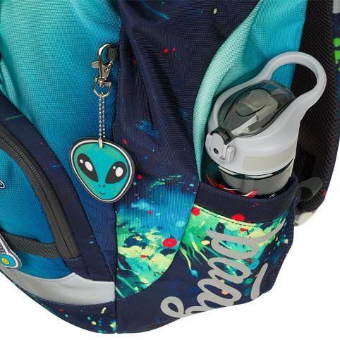 Jednokomorové vnitřní uspořádání s kapsou a gumičkou pro uchycení desek na zádové straně slouží ke snadné organizaci všech školních pomůcek.