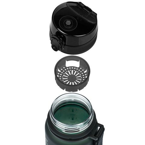 Uzamykatelné víčko nepropustí ani kapku nápoje a zaručuje jednoduché a intuitivní používání. Součástí láhve je i sítko, díky kterému můžete láhev použít i na limonády s ovocem nebo čaj (materiál je vhodný i pro horké nápoje). K láhvi je připevněné také poutko pro pohodlné nošení v ruce.