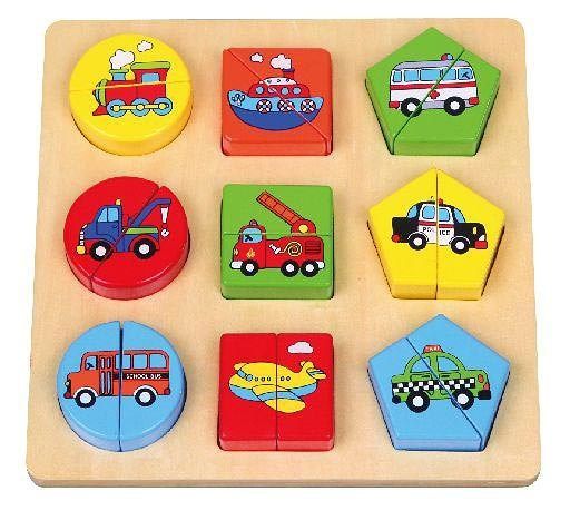 Puzzle - dopravní prostředky Dřevěné puzzle s dopravními prostředky. Každý dopravní prostředek se skládá ze dvou dílků. Hračka rozvíjí dětskou logiku a jemno motoriku. Z kolekce dřevěné hračky od kvalitní značky BABU. Rozměry: cca 20x20cm Věk 18m+