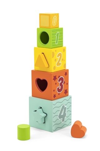 Pět dřevěných kostek, které se dají skládat na sebe i do sebe. Jednotlivé strany obsahují obrázky s různým motivem (číslice, zvířátka, vhazovací otvory) díky čemu je mnoho možností jak z kostek skládat. Každá kostka je očíslována od nejmenší k největší. Hračka je vhodná pro učení základních počtů, barev, a na procvičování motorických dovedností. Součástí jsou také různé kostičky, které lze do hračky vhazovat.