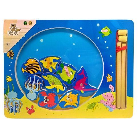Vkládačka rybolov moře Dřevěný rybolov - moře. Tato hrací deska procvičuje jemnou motoriku dítěte. Pomocí 2 rybářských prutů vyloví živočicha z moře a učí se jej zároveň i pojmenovávat. Z kolekce dřevěné hračky od kvalitní značky BABU. Rozměry: cca 30x22cm Věk 3+