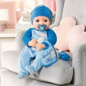 Panenka Baby Annabell Alexander ve velikosti 43 cm je oblečena do dupaček a čepičky. Součástí balení je bryndák, lahvička, dudlík a náhrdelník.