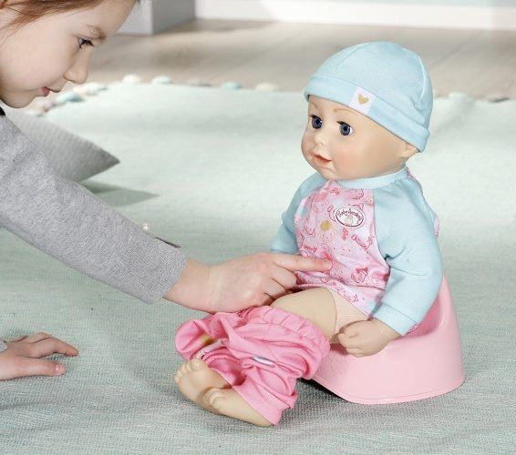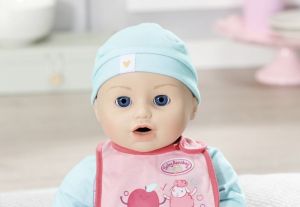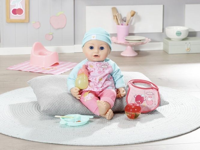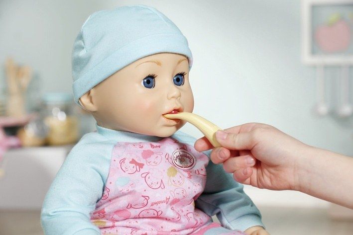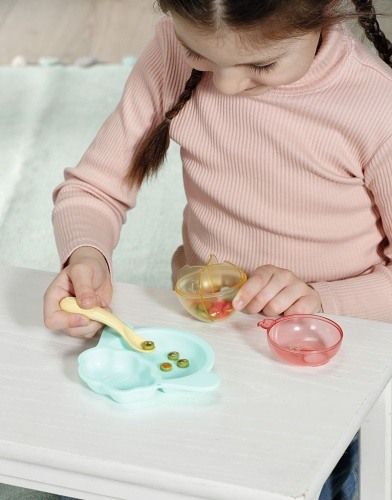 Oběd! Připrav Baby Annabell lahodný pokrm z jejích peciček s obrázky jídla. Malou labužnici můžeš krmit z talířku ve tvaru ovečky pomocí lžičky. Jakmile se lžička dotkne rtů, Baby Annabell otevře ústa a můžeš ji nakrmit. Nadšeně hýbe pusinkou a je dokonce i slyšet, jak jídlo polyká. Když už je plná, ústa zůstanou zavřená, rozpláče se a řekne “Mmm!” Možná už toho snědla až moc a bolí ji bříško? Po obědě je čas jít na toaletu. Po zmáčknutí bříška se Baby Annabell vykaká. V nočníčku pak najdeš pecičky s obrázky kakání. Někdy má Baby Annabell žízeň. Pak slyšitelně pije ze své lahvičky. Po krmení je čas na poobědové zdřímnutí. Jakmile Annabell položíš na záda, zavře oči. “Dobrou noc!” O čem se jí asi bude zdát? Třeba o její oblíbené brokolici, jablíčkovém pyré nebo mrkvové kaši. • Baby Annabell “Dobrou chuť” je panenka s realistickými funkcemi. • Může být krmena jejím vlastním jídlem a chodí na nočníček. • Baby Annabell umožňuje realistickou a nápaditou hru na maminku a tatínka a podporuje v dětech rozvoj odpovědnosti a empatie. • Funguje na baterie (nejsou součástí). Baby Annabell “Dobrou chuť” je panenka velikosti 43 cm v tričku, kalhotách a čepičce. Součástí je bryndák, lahvička, talířek, lžička, krabička na jídlo s pecičkami s obrázky jídla, nočník a pecičky s obrázky kakání.