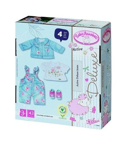 Džínová souprava, složená z kalhot, trička, bundičky a botiček, je určená pro panenku Baby Annabell do velikosti 43 cm. Holčičky mohou vybraný obleček panence obléci a směle vyrazit na procházku. Obleček se holčičkám bude snadno oblékat, je ušit ve střihu „easy fit“. Balení obsahuje kalhoty s laclem zdobené květinovým vzorem, bundička a bílé tričko také s jemným motivem a barevně sladěné ponožky.