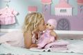 Roztomilá panenka sní o tom, že se jednou stane princeznou. I proto její dupačky vypadají jako princeznovské šaty. Nesmí chybět tylová sukýnka a potisk oblíbené ovečky v královských šatech. Dupačky jsou ušity ve stylu „easy fit“ a jejich převlékání hravě zvládnou i nejmenší ručičky. Hlavu panenky chrání čepička se srdíčkem. Když položíme panenku velikosti 36 cm na záda, zavře oči. Má látkové tělíčko s měkkou výplní a je ideální na hraní a mazlení. Při hraní bude mít u sebe i lahvičku. • Originální panenka Baby Annabell. • Model pro nejmenší (36 cm) s měkkým tělíčkem. • Oblečení ve střihu „easy fit“ pro snadné převlékání. • S mrkacíma očima. • Pozvolna probouzí chuť ke hře s panenkou a podporuje rozvoj empatie a smyslu pro zodpovědnost u dětí od jednoho roku. Baby Annabell Little Sweet Annabell je panenka velikosti 36 cm v dupačkách a čepičce. Součástí je lahvička.