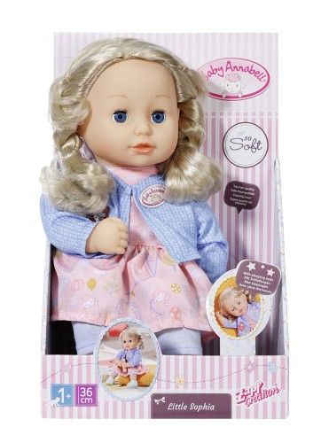 Baby Annabell Little Sophia je panenka ve velikosti 36 cm s mrkacíma očima. Je oblečena v 2v1 šatičkách a botičkách.