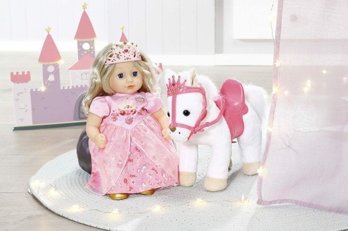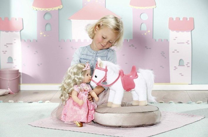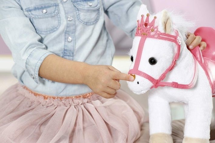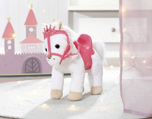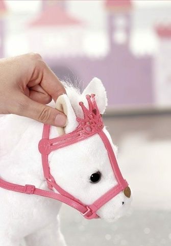 Co by to bylo za princeznu bez koně? Malé roztomilé princezny potřebují malé roztomilé poníky.Bílý poníček má královskou uzdu se třpytivou korunkou. Za ní má poník pozorně nastražená legrační ouška. Po stisknutí pravého ouška poník zařehtá nebo zafuní. Po stisknutí levého ouška uslyšíte klapot kopyt. Panenka Baby Annabell Little je zamilovaná do svého zvířecího miláčka a často mu dává pusinku na čumáček. Poník odpovídá zvukem polibku. Malá princezna při vyjížďce sedí pohodlně v sedle. Perfektně formované jezdecké sedlo zajistí, že v něm má panenka při jízdě potřebnou stabilitu. •Originální doplňky pro originální panenku Baby Annabell.•Se zvukovými efekty.•Hra s panenkou a příslušenstvím probouzí chuť ke hře s panenkou a podporuje rozvoj empatie a smyslu pro zodpovědnost u dětí od jednoho roku.•Funguje na baterie (nejsou součástí balení).Baby Annabell Little Sweet Poník pro panenky velikosti 36 cm se zvukovými efekty. Součástí je sedlo formované na upevnění panenky a uzda.