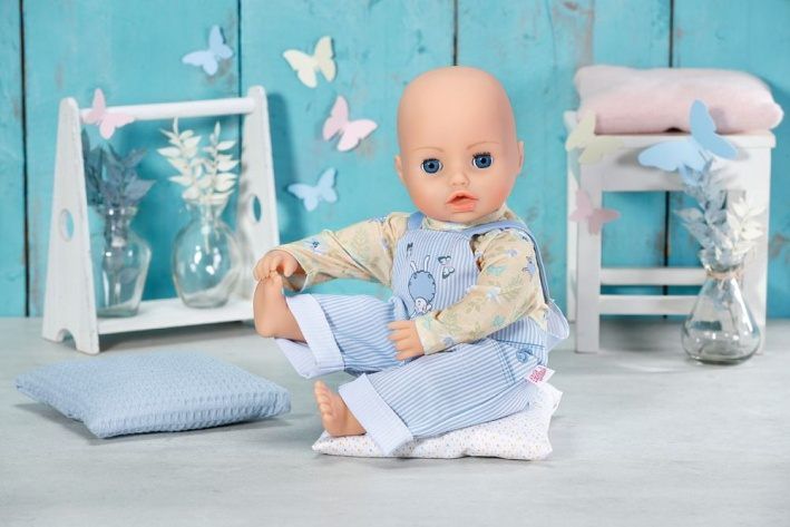 Toto ležérní oblečení dokáže obrátit svět vzhůru nohama. Pruhované kalhoty s laclem jsou velmi pohodlné a umožňují aktivní pohyb. Panenka v nich může udělat i stojku. Ovečka na kalhotách předvádí, jak na to. Pod kalhoty si Baby Annabell oblékla žluté triko s dlouhým rukávem ozdobené potiskem oveček, motýlů a květinových vzorů v modré a zelené barvě.