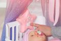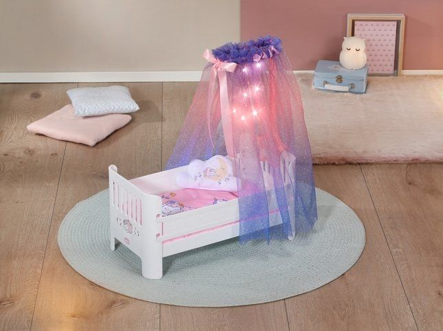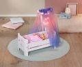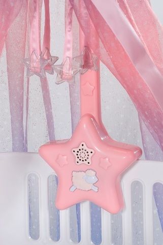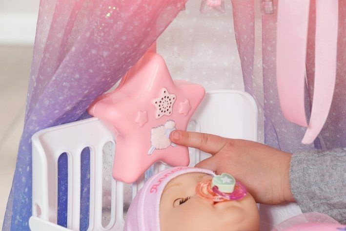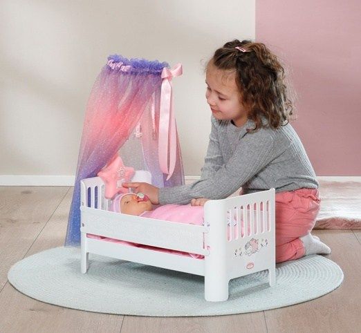 Nová postýlka Sladké sny pro panenky Baby Annabell je skvělým místem pro spinkání panenek. Krásná postýlka s měkkou přikrývkou a nadýchaným obláčkovým polštářkem hraje uklidňující melodii, která pomáhá panenkám usnout. Po stisknutí tlačítka se rozsvítí hvězdička, která osvětlí nebesa jako by to byla opravdová obloha. Baby Annabell se to moc líbí. Dobrou noc, Baby Annabell!• Originální doplněk pro panenky Baby Annabell.• Pečlivě navržené doplňky rozvíjejí dětskou představivost a otevírají nové možnosti a témata hry.• Funguje na baterie (nejsou součástí).Baby Annabell Postýlka Sladké sny s osvětlenými nebesy a s ukolébavkou. Součástí je matrace, přikrývka a polštářek. Na baterie: 3x AAA (jsou součástí balení)