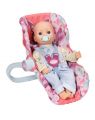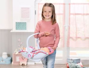 S láskou navržená sedačka je potažena látkou s květinovým potiskem. Baby Annabell si může pohodlně opřít hlavičku o obrázek ovečky s křidélky, zatímco modrý systém bezpečnostních pásů ji bezpečně drží v sedačce.