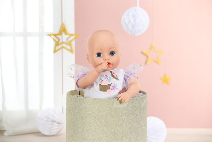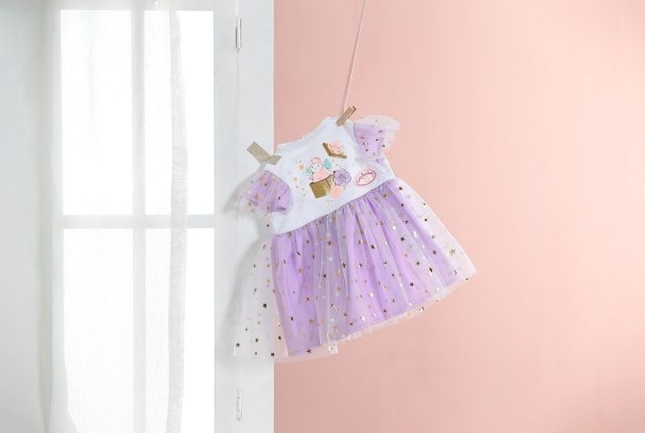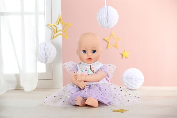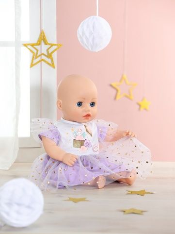 Baby Annabell si s těmito hravými fialovými šatičkami sáhne ke hvězdám. Zlaté hvězdičky na sukni a rukávech dodávají šatům extra šmrnc.