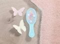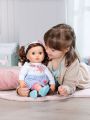 Horní díl šatů má bílou barvu a sukně modrou. K tomu si Isabella oblékla růžové legíny. Kvalitní hnědé vlásky jí můžeš česat modrým kartáčem a upravovat do stále nových účesů. V tmavých vlasech se skvěle vyjímá modrá čelenka s růží.