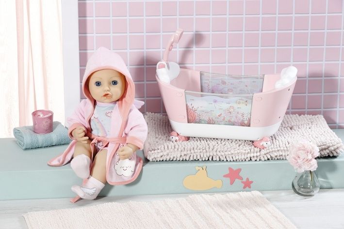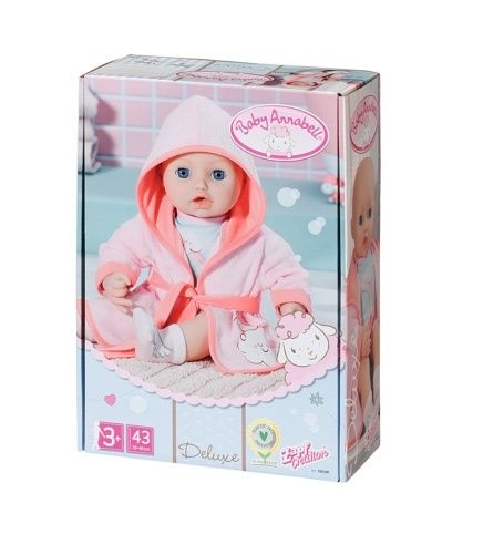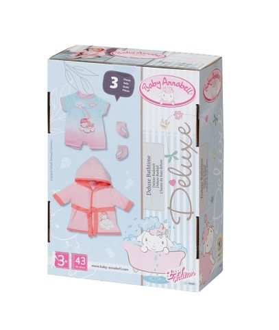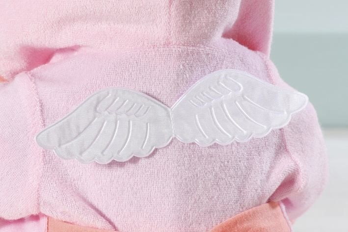 Z Baby Annabell se stala opravdová milovnice koupání. Ze své kouzelné vany je naprosto nadšená. To proto má i roztomilý župan s kapucí. Copak nám asi chtějí prozradit křídla na zadní části župánku? Možná, že je Baby Annabell skutečný andílek a pečlivě se umyla i za ušima? Pod županem má čistotná panenka krátký overálek. Na obrázku overalu je ovečka na obláčku, která si užívá duhovou sprchu. Souprava obsahuje také růžové ponožky s obrázky křídel, aby nožičky panenky zůstaly hezky v teple i na studených dlaždičkách. •Originální oblečení pro originální panenku Baby Annabell. •Kvalitní příslušenství podporuje fantazii a přináší nové podněty a možnosti pro hraní. Baby Annabell Župan a pyžamko pro panenky velikosti 43 cm. Součástí je župan, overal a ponožky. Rozmě balení cca 28,5 × 20,5 × 9 cm. Věk 3+