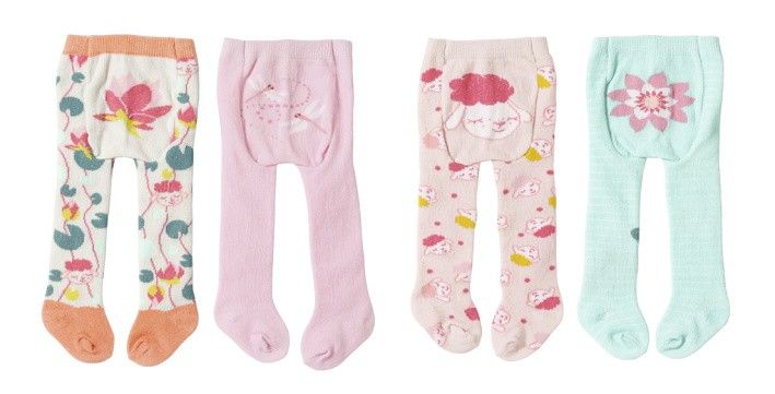 Baby Annabell Punčocháče (2 páry) pro panenky ve velikosti 43 cm. Na výběr dvě sady. Sada 1: růžové s vážkami a béžové se vzorem leknínů. Sada 2: mátové s leknínem a meruňkové s motivy oveček.