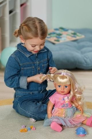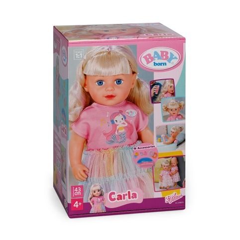 BABY born Carla má krásné, vysoce kvalitní vlásky a součástí je 7 doplňků na česání. • Zábava při česání: Dlouhé kvalitní vlásky z nylonu se skvěle češou. • Se 7 doplňky: Carla má 1 kartáč, 2 gumičky a 4 sponky do vlasů. • Skvělá pohyblivost: Hýbe rukama, otáčí hlavou a má ohebné kolenní klouby. • Dokáže sama stát: Carla umí stát sama bez opory. • Nový outfit: Roztomilé tričko, barevná tylová sukně a stylové boty. • Může se koupat: Díky pevnému tělíčku ji můžete vzít i do vany.