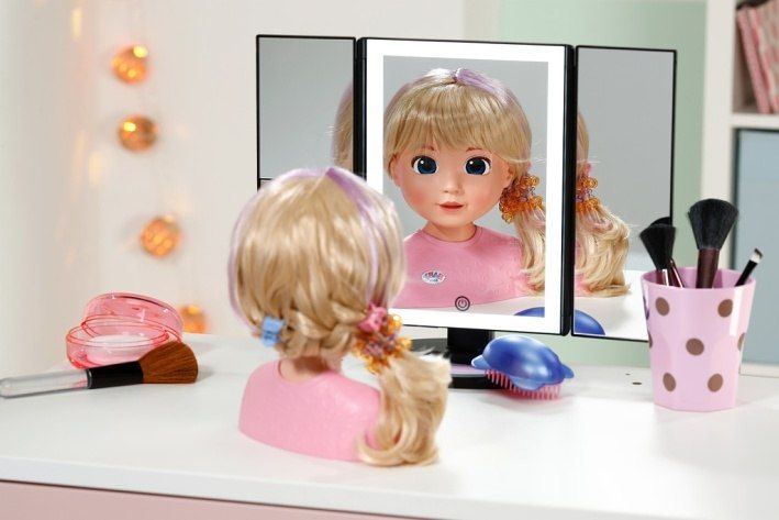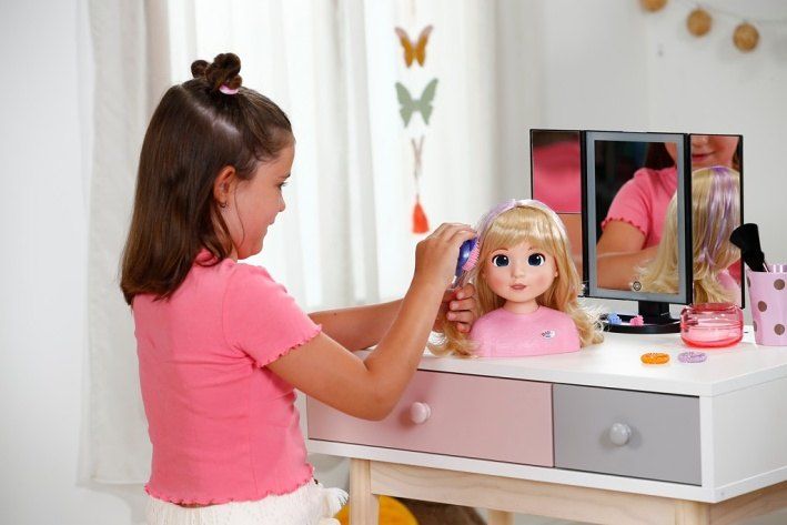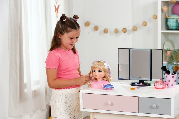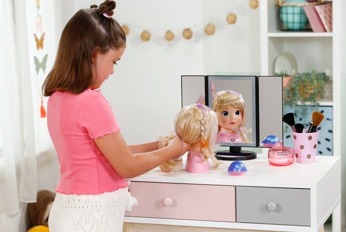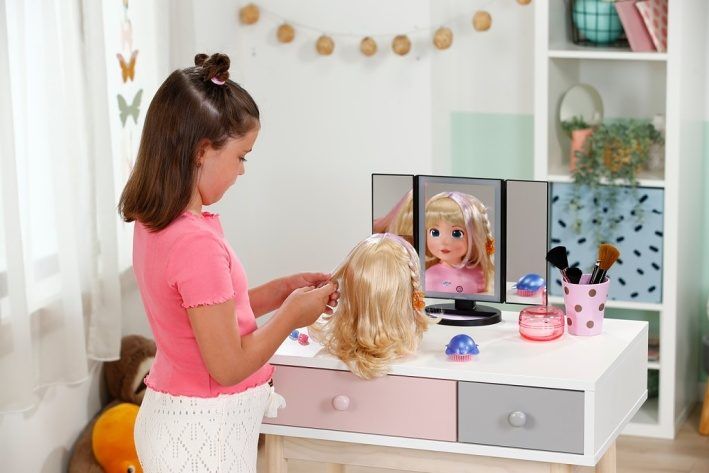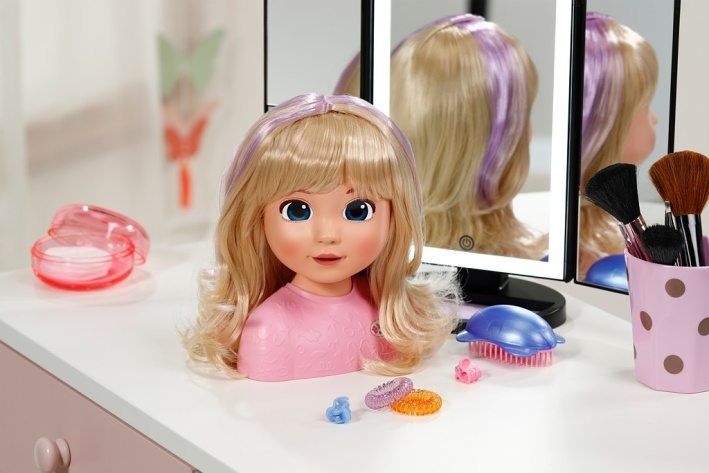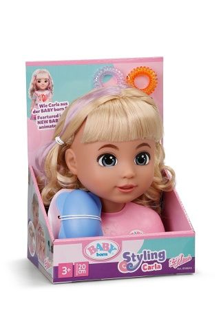 BABY born Česací hlava Carla s doplňky. • Kvalitní vlasy: Vysoce kvalitní nylonové vlasy, které se snadno češou a upravují. • Mnoho doplňků: kartáč, sponky a gumičky. • Vhodné pro děti od 3 let.