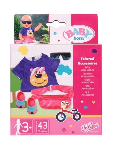 S novými cyklistickými doplňky je BABY born připravena na příští cyklovýlet. BABY born teď může šlapat ještě usilovněji, má totiž nové cyklistické boty s protiskluzovou podrážkou. Praktická růžová ledvinka má velikost tak akorát, aby se do ní vešly stylov