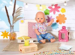Cestování po nejkrásnějších místech na zemi obytným autem, večerní hraní na kytaru u táboráku... Panenka BABY born má na takové výlety připraven pravý hippie obleček. Halenka je celá poseta květinovým potiskem, má splývavé krátké rukávky ukončené volánkem a hravé nařasení v pase. K tomu se skvěle hodí kalhoty do zvonu v džínovém vzhledu s našitým kapsami. Dokonce i kalhoty jsou potištěny květinami a půvabným motýlkem. Prostě jak se anglicky říká „síla květin“ – flower power!