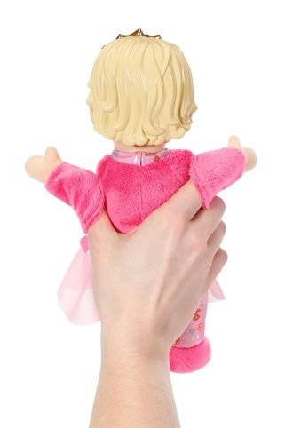 Tahle princeznička přinese do dětských pokojíčků kouzelné chvíle. Panenka – maňásek obživne, jakmile vsunete prsty do malých kapsiček na pažích panenky. Měkká vinylová hlavička se zlatou korunkou dodává panence královský vzhled a měkce vycpané tělíčko je