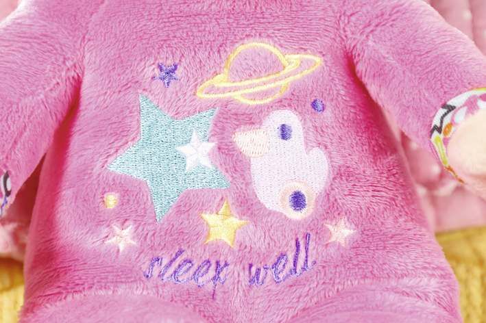 noc!“ Krásná výšivka zdobí i růžové dupačky. Panenka má měkkou