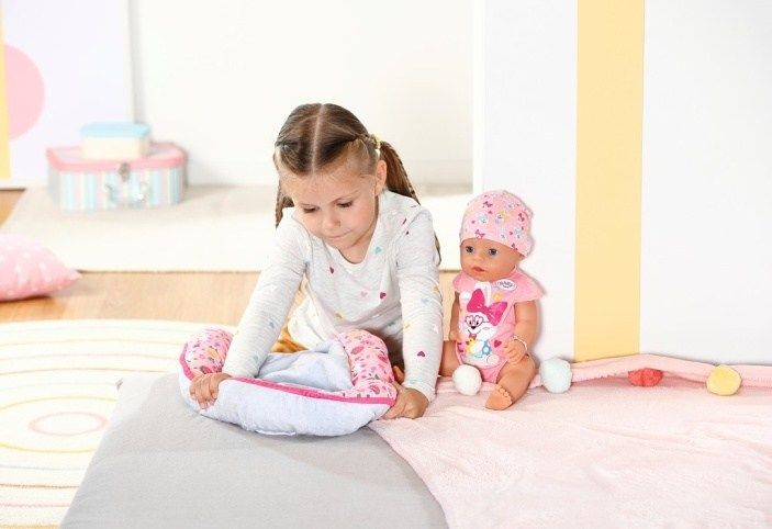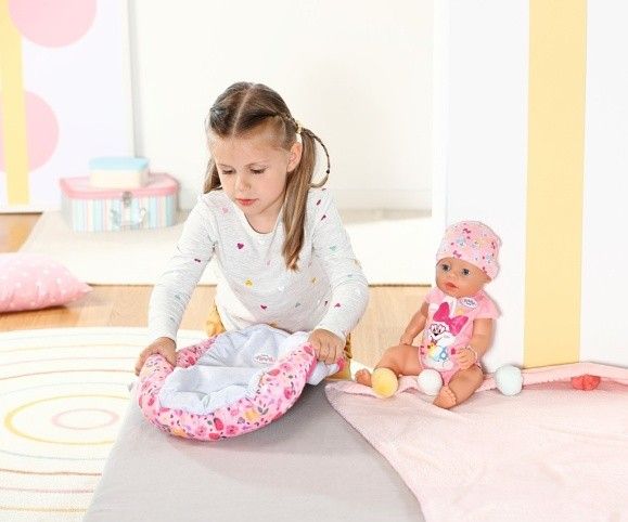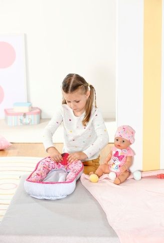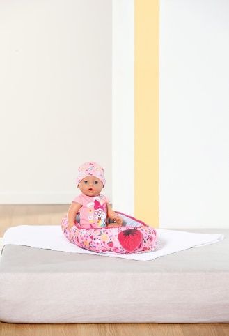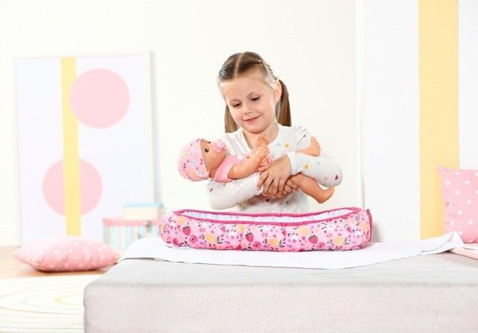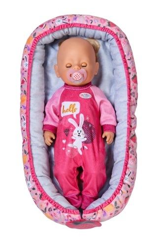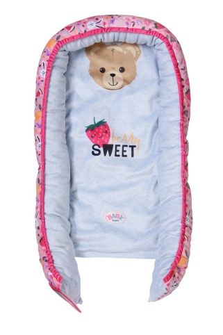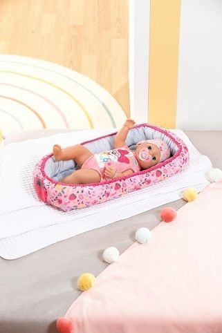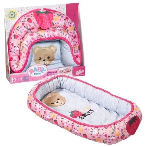 BABY born tiše leží ve svém hnízdečku a užívá si pohodlí. Barevné hnízdečko v hravém designu s obrázky ovoce a zvířátek má ve spodní části uzavíratelný otvor, takže BABY born lze snadno vyjmout z hnízdečka, vložit ji do něj a hrát si s ní v hnízdečku. Díky měkkému polstrovanému okraji je panenka v bezpečí a pohodlí, ať už je na pohovce nebo na podlaze v dětském pokoji. Díky oboustrannému designu se dokáže přizpůsobit svému okolí a zůstává pestrým doplňkem v dětském pokoji. • Hravý oboustranný design v zářivých barvách: barevné hnízdečko s modrošedým vnitřkem zdobí obrázky ovoce a BABY born zvířátek. • Různé hraní: díky otvoru na okraji lze BABY born z hnízdečka snadno vyjmout a zpátky ji do něj vložit nebo si lze s panenkou hrát i uvnitř v hnízdečku. • Útulné a bezpečné: díky měkkému polstrovanému okraji nehrozí, že by BABY born z hnízdečka vypadla. • Vhodné pro panenky velikosti 43 cm a 36 cm.