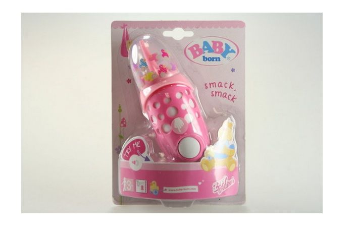 Když lahvičkou krmíte panenku BABY born, uslyšíte zvuk sání. Stejně tak se zvuk ozve, když podržíte tlačítko na lahvičce. Jakmile lahvičku miminku odeberete z úst (nebo uvolníte tlačítko), ozve se zvuk krknutí. Lahvička má pohodlné držadlo, aby malým maminkám nevyklouzla z ruky a ozdobný uzávěr s motivy BABY born.